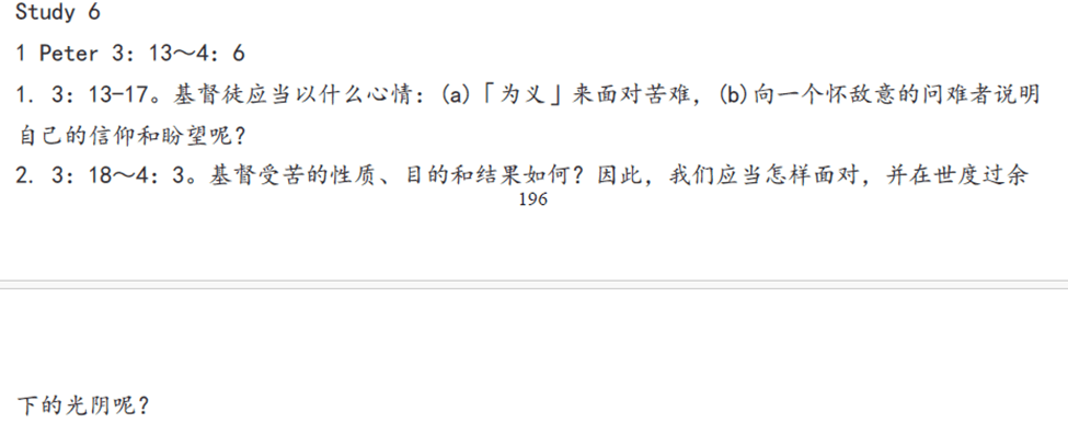 反思:人生在世几十载,时间匆匆流逝似烟云,人人都要受苦,无苦不成人生:有的苦是相对的,有的苦是绝对的;有的苦是自找的,有的苦是外加的;有的苦是有益的,有的苦是徒然的。“为义受苦“显然是最好的一种受苦方式。主看千年如一日,一日如千年。主让我们来到世间看到这一切,祂透过各样环境唤醒我们的灵,为的是拯救我们进入永恒。我们已经被祂得着的人虽然表面与世人无异,灵里却是完全不同;身体不断老去,内心却一天新似一天。我们能做的就是行善、行义、尊主为大,常作准备为主做见证,总要多救一些人。主还没有来,并不是耽延,而是因为怜悯和爱。我们要趁着光阴,趁着还有机会,传福音给人,盼望着将来更多人可以被救赎。