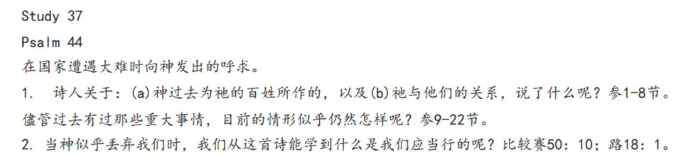 问题1、诗人关于(a )神过去为祂的百姓所作的:”赶出外邦人,却栽培祖先;苦待列邦,却叫祖先发达”(2节);“得地土”、“得胜”(3节);“推倒敌人”(5节)