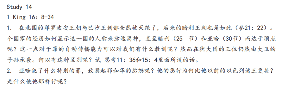 问题1、在北国的耶罗波安王朝与巴沙王朝都全然被灭绝了,后来的暗利王朝也是如此(参21:22)。一个国家的经历如何显示这一国的人愈来愈远离神,直至暗利(25 节)和亚哈(30节)而达于顶点呢?