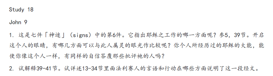 问题1、这是七件神迹中的第6件。它指出耶稣之工作的哪一方面呢?参5,39节。开启这个人的眼睛,有哪几方面可以与此人属灵的眼光作比较呢?你个人所经历的耶稣的大能,能使你像这个人一样,有同样的自信答复那些批评祂的人吗?