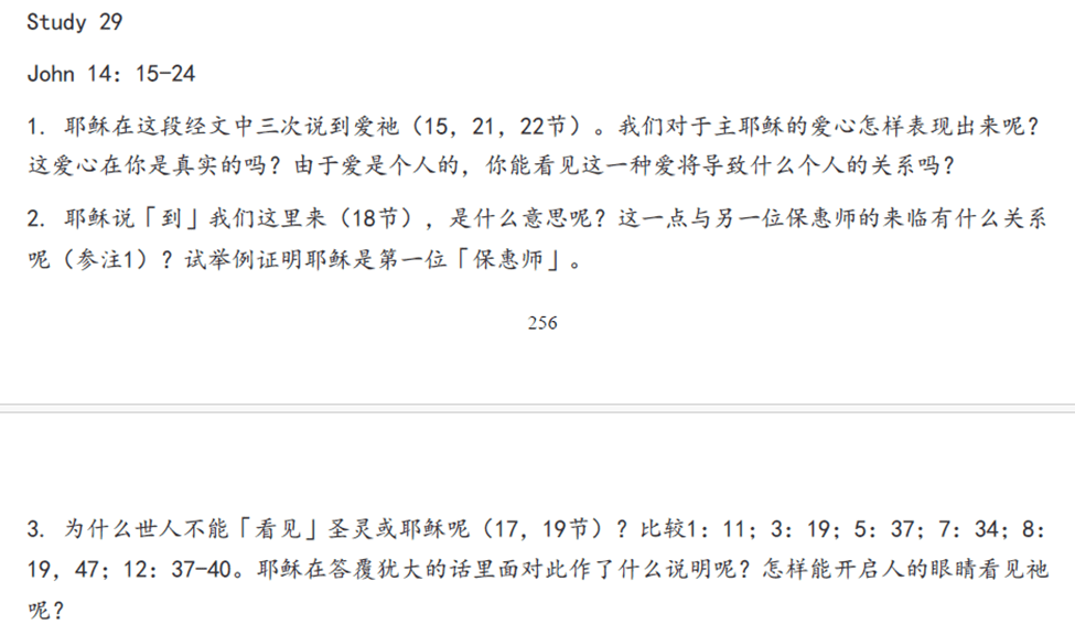 问题3、为什么世人不能「看见」圣灵或耶稣呢(17,19节)?比较1:11;3:19;5:37;7:34;8:19,47;12:37-40。耶稣在答覆犹大的话里面对此作了什么说明呢?怎样能开启人的眼睛看见祂呢?