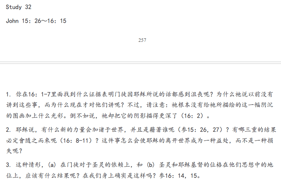 问题1. 你在16:1-7里面找到什么证据表明门徒因耶稣所说的话都感到沮丧呢?为什么祂说以前没有讲到这些事,而为什么现在才对他们讲呢?不过,请注意:祂根本没有给祂所描绘的这一幅阴沉的图画加上什么光彩。倒不如说,祂却把它的阴影描得更深了(16:2)。