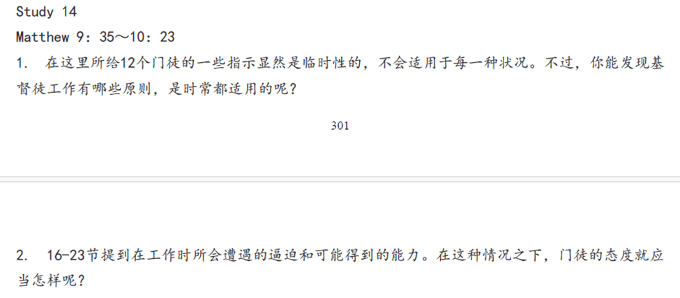 基督徒时常都适用的工作原则:1)怜悯人,求庄稼的主打发工人出去收庄稼,去牧养群羊;2)用行动,随走随传天国的福音;3)医病赶鬼,将自己所得传递出去,显出神的荣耀和大能,为基督作见证;4)进入人家中,给人平安的祝福,若是不被接待,就断然离开,既和平又有见证。