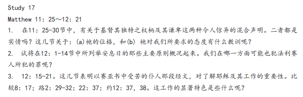 在11:25-30节中,有关于基督其独特之权柄极其谦卑这两种令人惊异的混合声明,二者都是实情,(a)祂的位格: “一切所有的,都是我父交付我的。” 主耶稣是父神独生子,祂是神与人之间唯一的中保,所以唯有祂有独特的权柄。主耶稣完全认识父,也唯有祂能将父启示给人,是三位一体神的第二个位格。与此同时,主耶稣与父神同质,有父神爱的能力,又柔和谦卑,完全顺服神的旨意。这两种特质完全不冲突。(b)祂对我们所要求的态度:1)来到祂面前,将自己的重担放在主耶稣那里,与耶稣同父一个;2)学习祂的样式,心里也柔和谦卑。