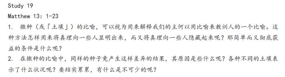 在撒种的比喻中,同样的种子竟产生这样差异的结果,其原因不在于种子,而在于人的心田是否适宜种子成长。各种不同的土壤表示了撒种之后会有不同的反应,即人听了主的道也会产生不同的结果:1)路旁的土:心刚硬,不领受道,被撒但夺去(13:19);2)石头地:表面接受,但没有根,遇到患难就跌倒(13:20–21);3) 荆棘地:道被世上的思虑和钱财迷惑挤住,不能结果(13:22);4) 好土:听道、明白、存记并结实,有三十倍、六十倍、一百倍(13:23)