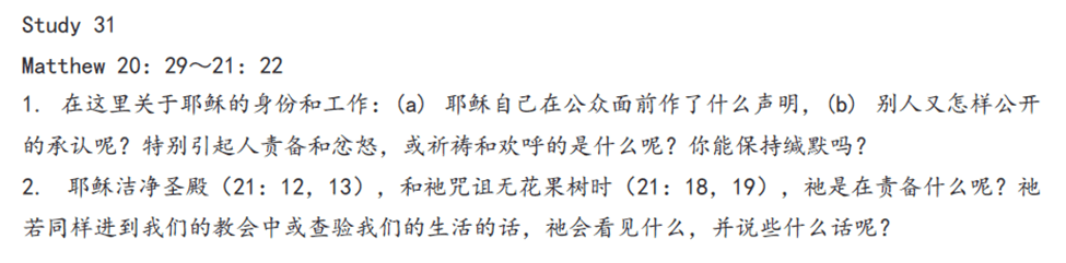 马太福音20:29~21:22描写了耶稣进入耶路撒冷前后的几个关键事件:祂医治瞎子、荣耀进城、洁净圣殿、咒诅无花果树——这些都公开宣示了祂的身份,也揭露了祂对假敬虔的严正态度。