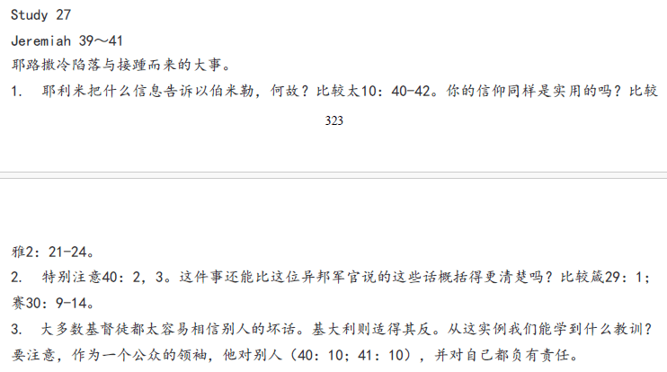 耶利米书39~41章讲述了耶路撒冷陷落,耶利米被释放,被委派的总督基大利被以实玛利暗杀,约哈难又把被以实玛利掳去的众人抢回来。