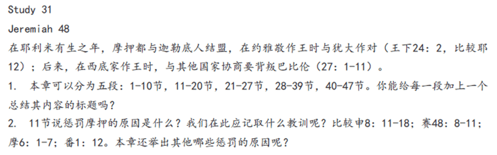 本章还举出其他惩罚的原因是:(1)骄傲与自夸(48:26, 29)摩押“向耶和华夸大”,高举自己,轻看神的主权。(2)讥诮神的百姓(48:27)摩押曾讥笑以色列,如今自己落入同样的羞辱。(3)倚靠势力与财富(48:7)“你因倚靠自己所做的和自己的财宝”,而非倚靠耶和华。(4)拒绝悔改、持续悖逆。不是一时犯罪,而是长期顽梗、无感于神的提醒。